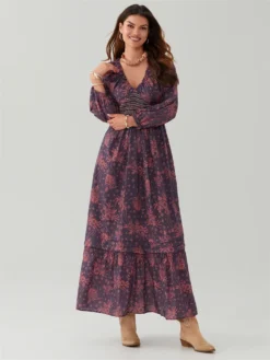 Womens Bohemian Floral Dress Summer Half Sleeve V Neck Shirred Waist A-Line Dress Long Flowy Dress