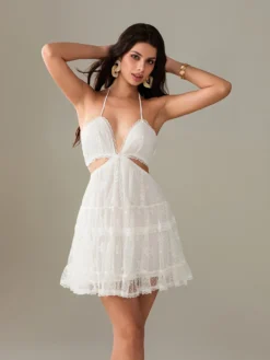 Women Mini Dress Lace V-Neck Tie-Up Halter Neck Hollow-Out Sleeveless Dress Summer Casual A-line Dress