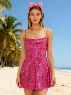 Women Shiny Sequins Dress Summer Backless A-Line Mini Party Dress for Cocktail Beach Streetwear