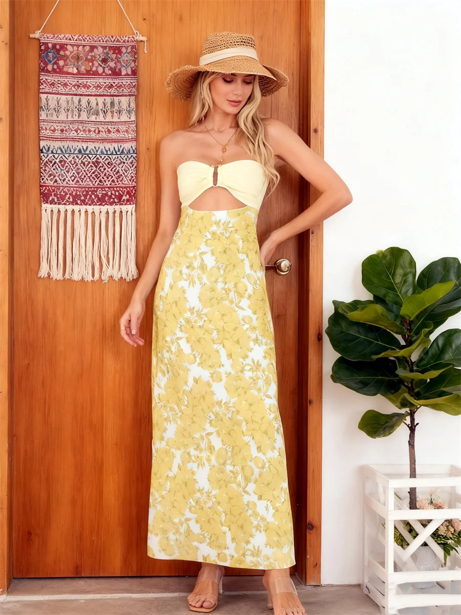 Strapless Dress for Women Stylish Hollow Out Solid/Floral Print Bow Tie Back Sleeveless Tube Long Bodycon Dress